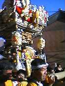 このお神輿、地区ごとにひとつずつありまして、左の屋根がサブトン三枚重ねたみたいになっているお神輿が、大宮の地区のものです。